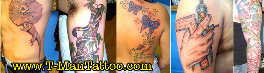 At T-Man Tattoo Inc, we want you to be comfortable and happy with your tattoo or body modification experience. T-Man Tattoo Inc, realizes that our clients may be a little nervous, especially if the tattoo or body modification is your first, but our artist will take that extra time to answer any question you may have and to make your tattoo or body modification a positive experience. At T-Man Tattoo Inc, we believe in customer satisfaction. Remember, your tattoo is permanent, so take the time to make sure that you are really getting what you want, and that you are getting it from the most talented and qualified artist in the area with lowest rates in town on Tattoos!!
